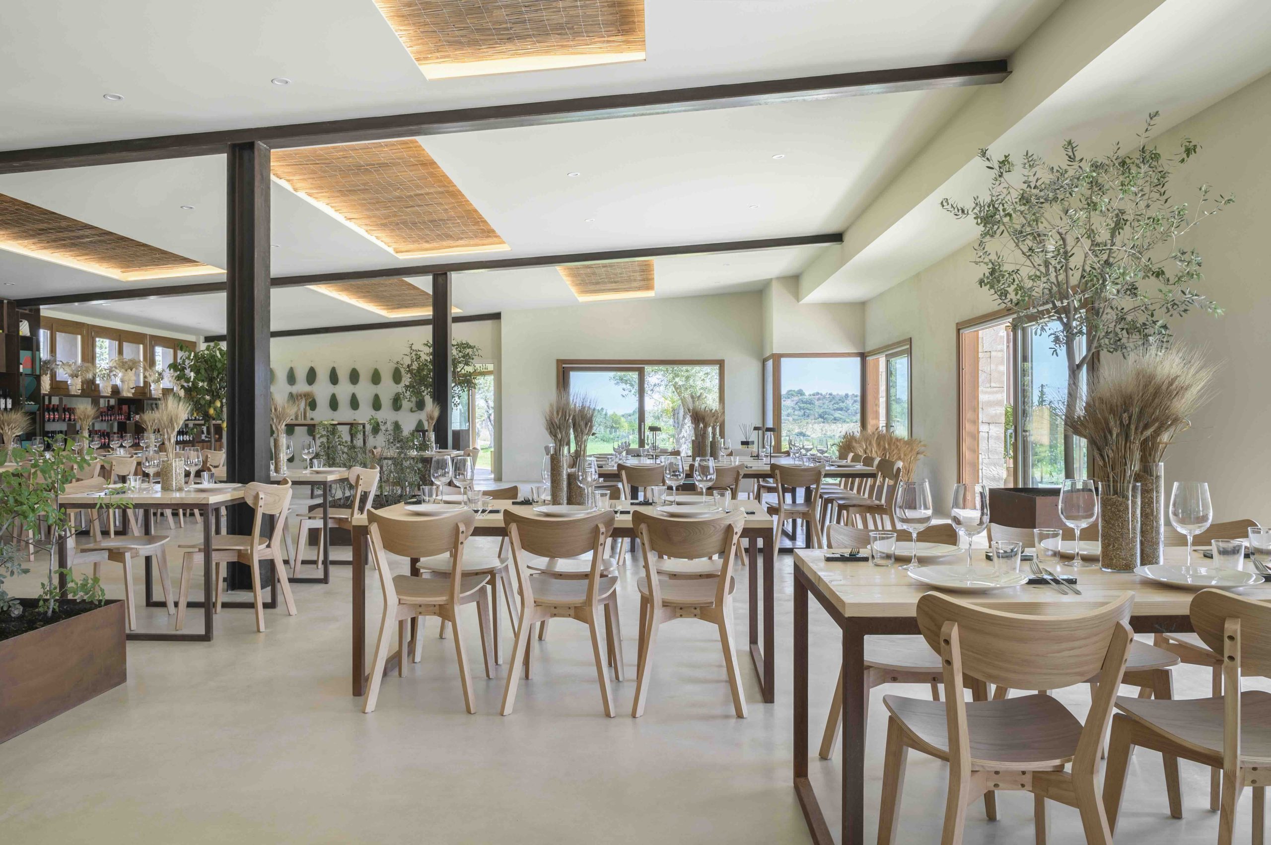 Da Siko - Mercato con Cucina, nella campagna di Noto (Sr), la sala fa eco alla natura, con la quale stabilisce un dialogo attraverso le ampie superfici vetrate che incorniciano il paesaggio. Gli arredi in corten ricordano le tinte del terreno, tavoli e sedute in legno richiamano il cuore degli alberi, le decorazioni a parete sono un riferimento alle pale di fico d’India. «Aldilà delle caratteristiche ergonomiche e della funzionalità della cucina - spiega Salvatore Spataro, progettista di Siko -, l’aspetto di una sala deve legarsi all’ambiente circostante».