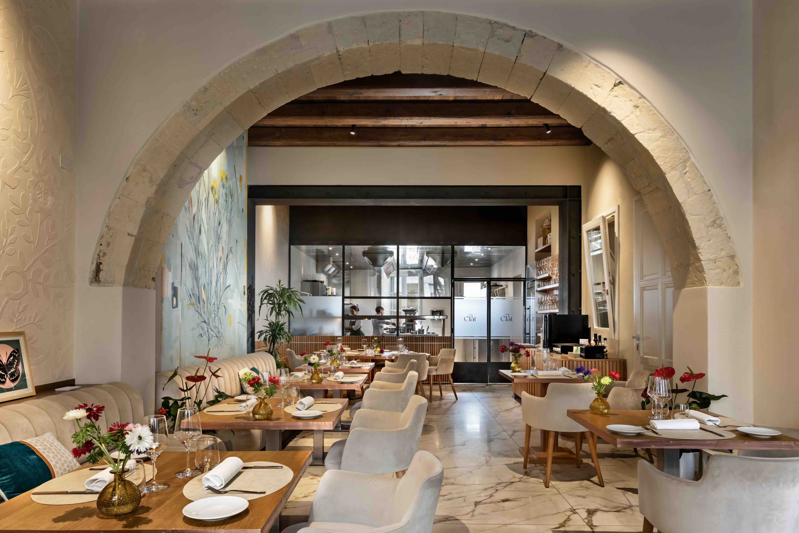 La boiserie in rovere rimanda alle barche tipiche dello stagno di Cabras, il pavimento in pietra bianca richiama le sabbie di quarzo di Is Arutas, il trattamento delle pareti in altorilievo allude alle rocce calcaree presenti lungo la costa. «Casa Clàt diventa un ambiente avvolgente e unico perché ogni elemento parla di sé senza strillare, con la riservatezza e l’orgoglio tipico dei sardi - racconta Giorgio Casu, autore del concept e direttore artistico di Casa Clàt -. Ho voluto aggiungere infine un elemento iconico nel mezzo della sala: l’elicriso disegnato a matita e foglia oro. Trovo che il ricordo del suo profumo penetrante racconti le notti in Sardegna in modo magico».