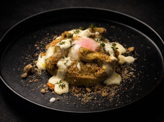 Cremoso di carciofi e patate, uovo a 64°, salsa di pecorino e pane croccante