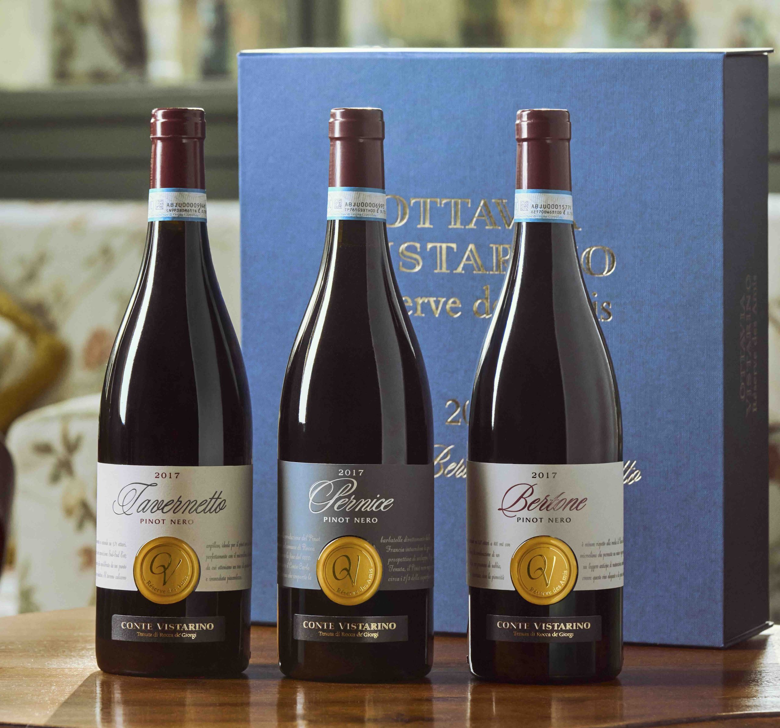 Le cassette (prezzo: 210 euro), numerate e arricchite da dettagli artigianali, propongono: Bertone: vendemmie 2013, 2017, 2019, Tavernetto: vendemmie 2013, 2015, 2019, Orizzontale 2017: Pernice, Bertone, Tavernetto
